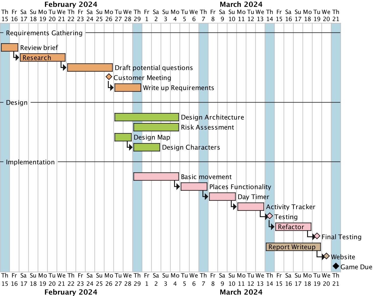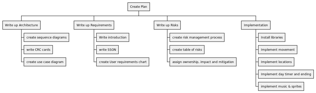 By the end of the second week, we had gained a comprehensive understanding of product requirements and commenced writing the requirement documentation. Simultaneously, we initiated our risk assessment process. Weekly meetings were supplemented with impromptu meetings as needed, during which roles and tasks were delegated, and design brainstorming sessions were held for the game.