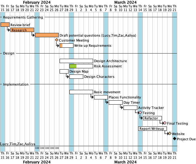 In week four, substantial progress was achieved as implementation commenced. The map design was finalised, and initial drafts of the architecture were completed, later updated to accommodate ongoing implementation. Key features such as the home screen, preferences, and basic movement were implemented. To ensure timely completion, additional meetings were held, clarifying individual responsibilities and ensuring adherence to deadlines.