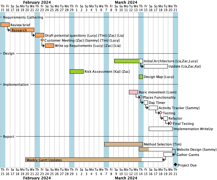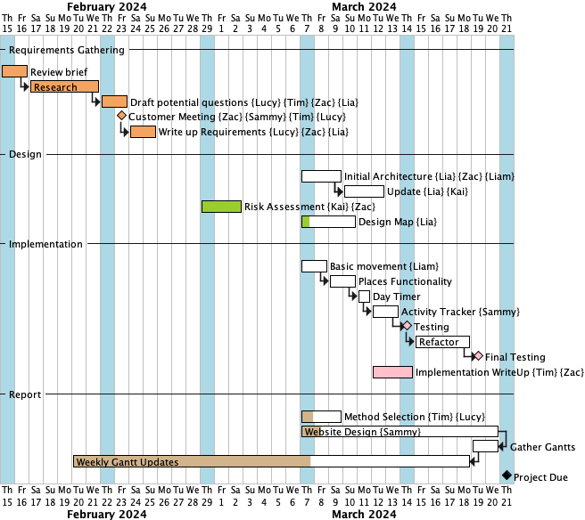 During the first week, our team focused on getting to know each other and understanding project requirements. We conducted a thorough review of the product brief provided by stakeholders and initiated requirements elicitation through the creation of interview questions. We scheduled a customer meeting for February 26th. Project management tools, such as GitHub, were set up alongside the creation of a Gantt chart to outline our project timeline.