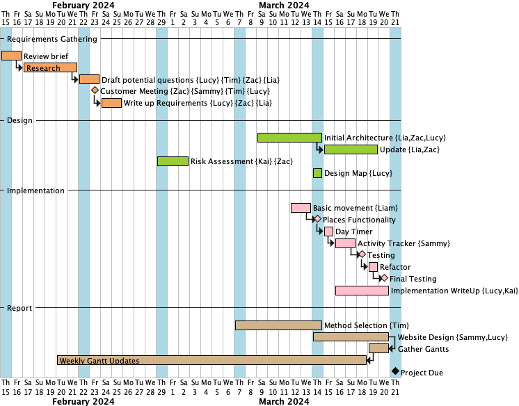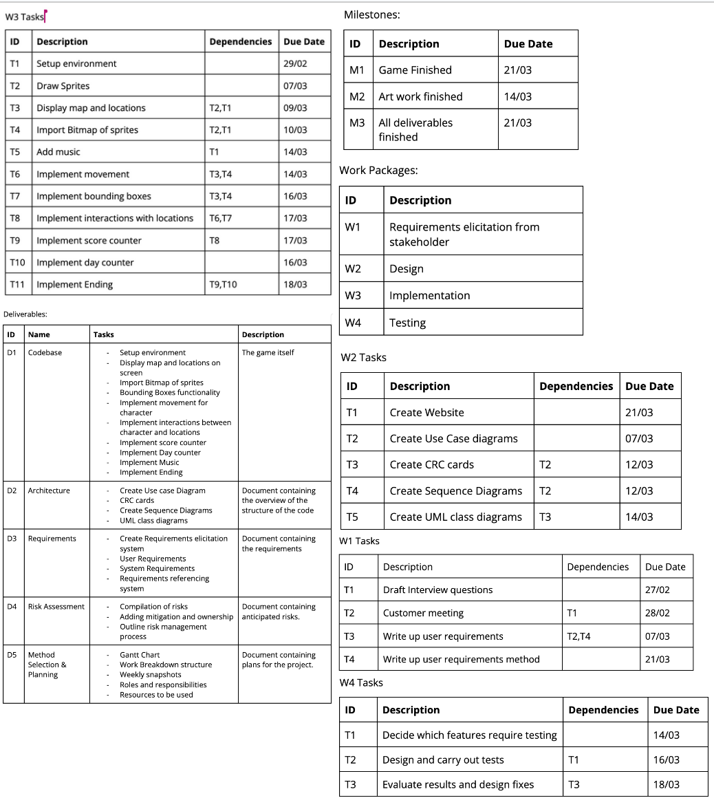 At the end of week three, significant progress was made in completing documentation. Discussions on architecture design enabled the assigned team members to initiate this phase. Concurrently, the risk assessment was finalised, and research on map design commenced. The project website was established, and the method selection writeup started. The Gantt chart was updated to reflect current role assignments and included all sections of the report.